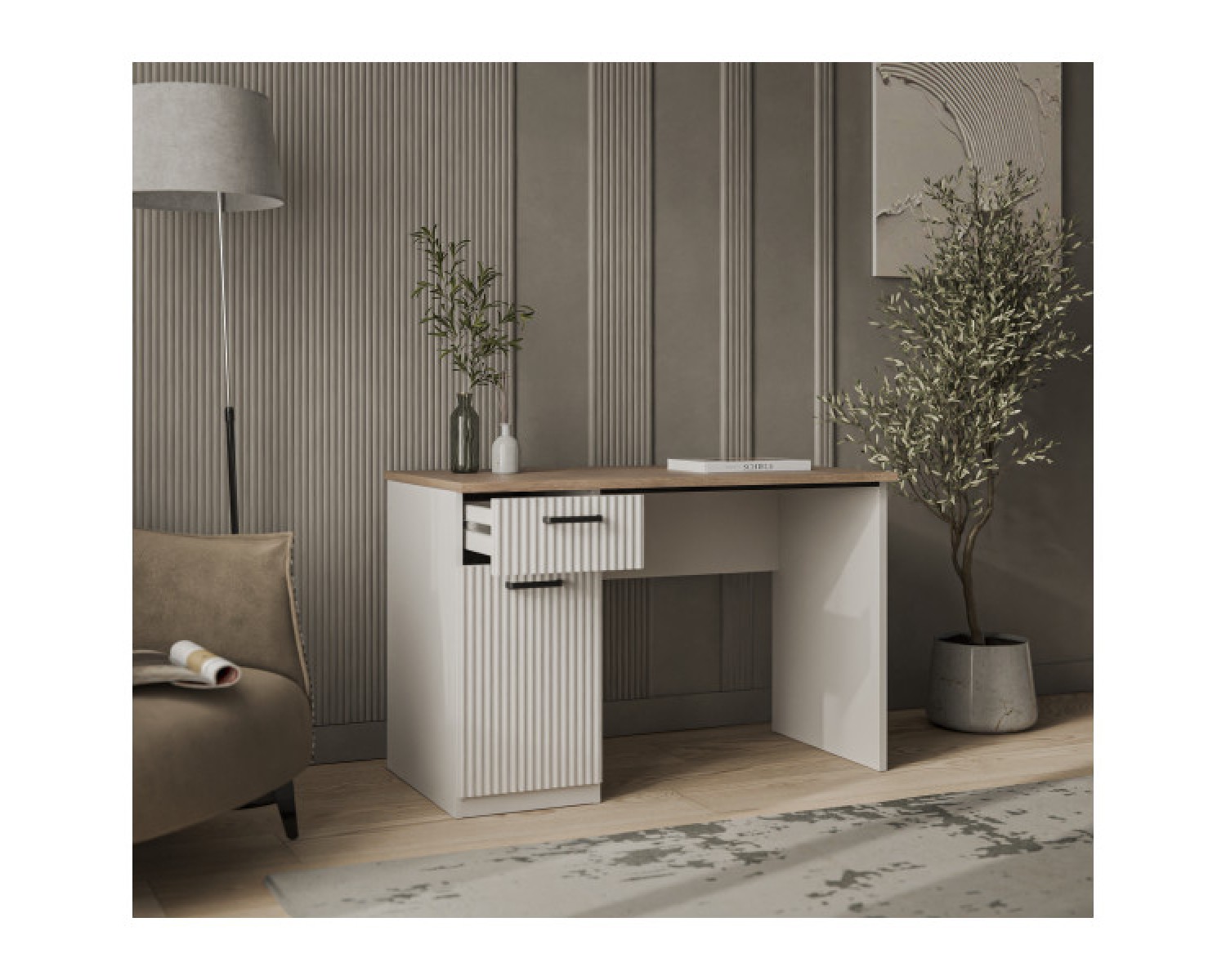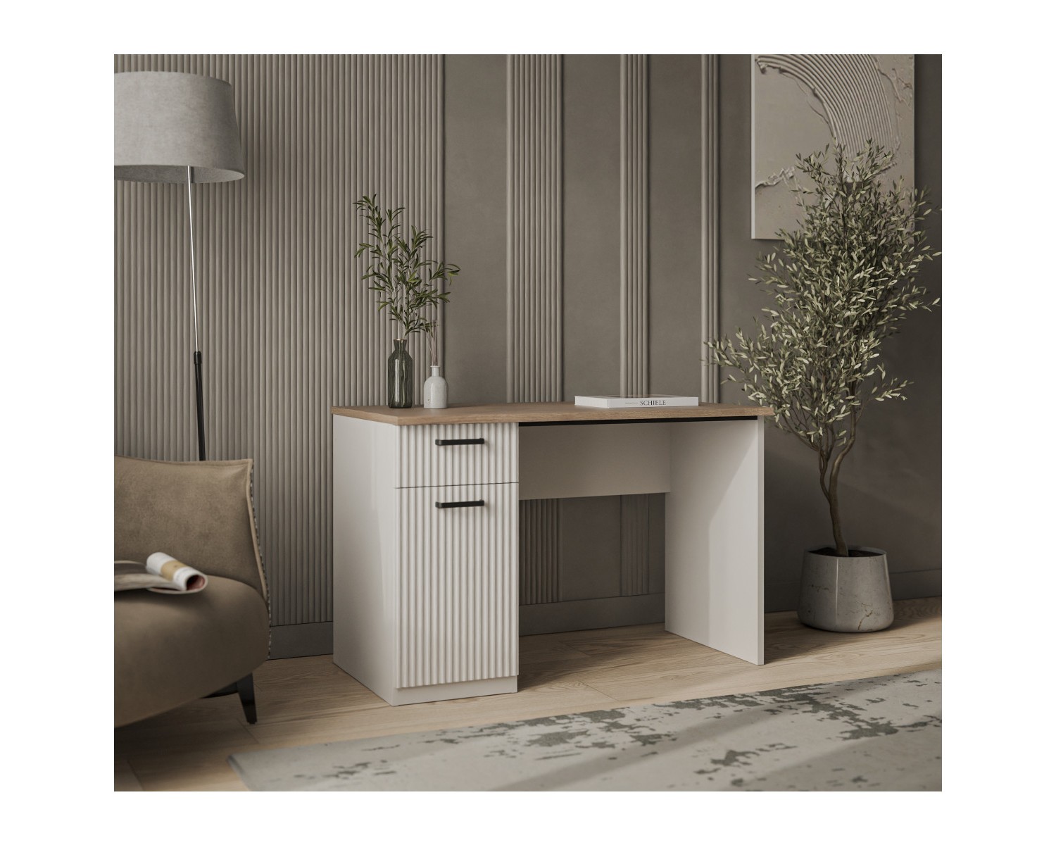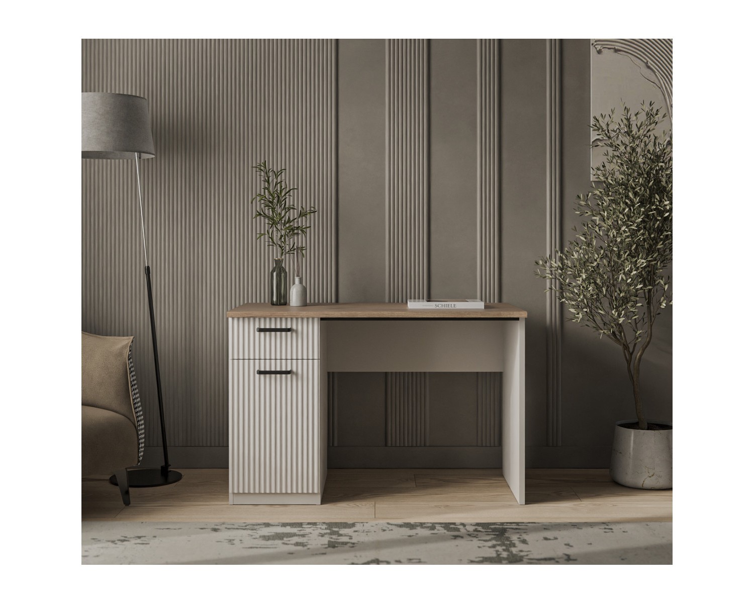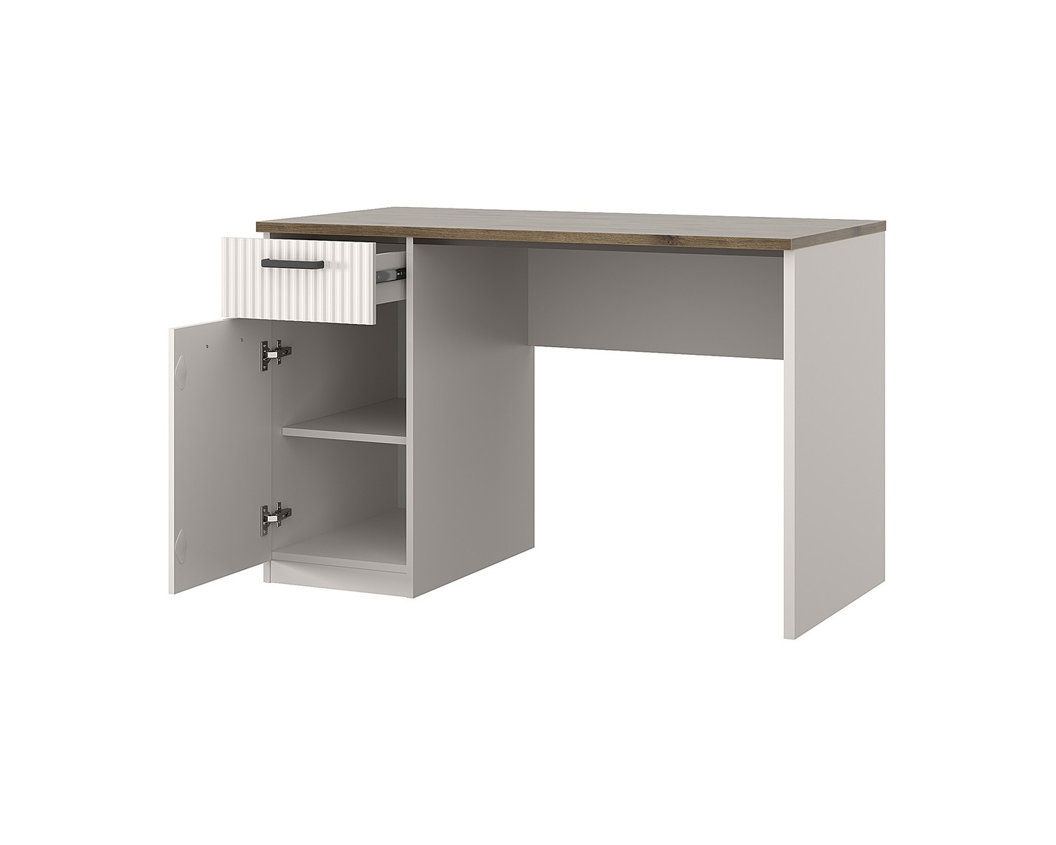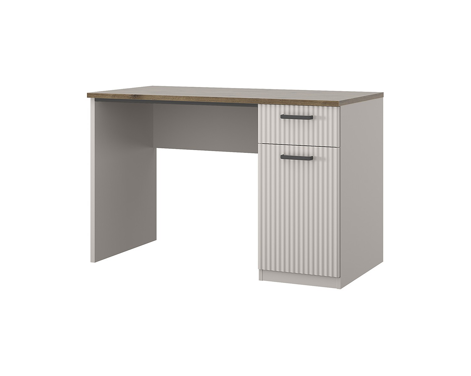 Стол письменный 1D1S организует учебную и рабочую зону в молодёжной/детской комнате и кабинете. Имеет прямую конструкцию, которая представляет собой столешницу прямоугольной формы, стационарную тумбу с одним отделением за глухой дверью (1D), один выдвижной ящик (1S), опору и панель переднюю. Дверь (1D) распашная, крепится к боковому корпусу изделия. Особенностью элемента является эстетический внешний вид, комплектация петлями с доводчиками, универсальная установка тумбы.