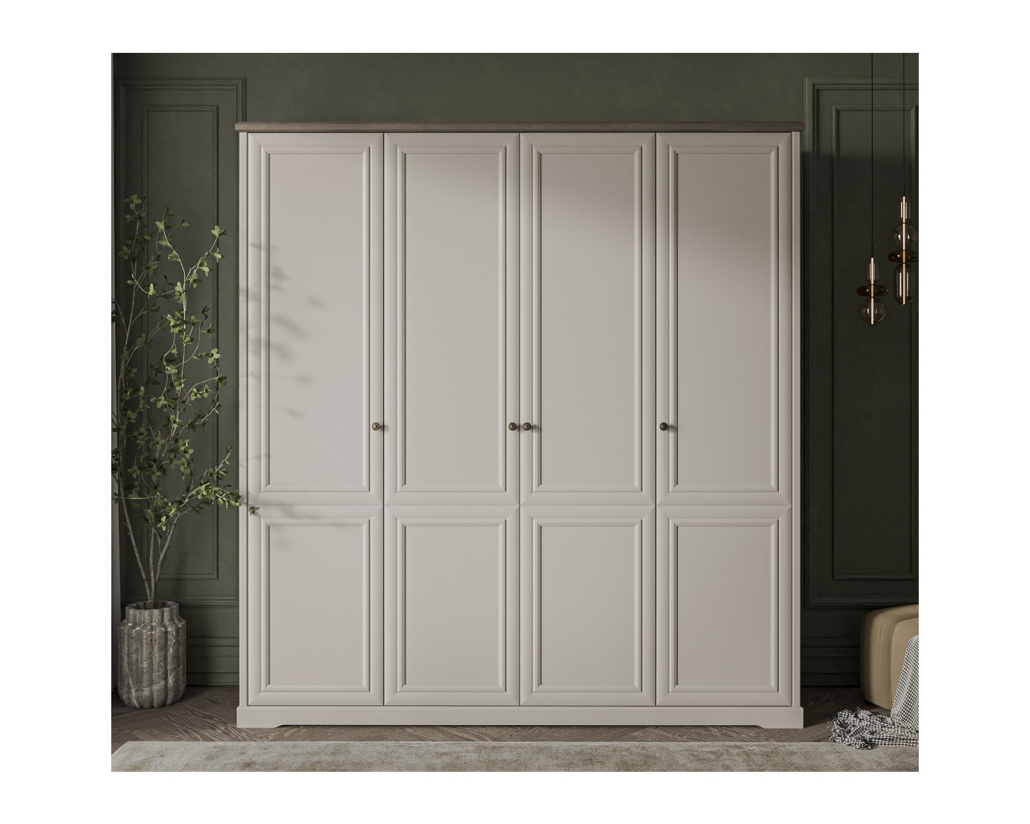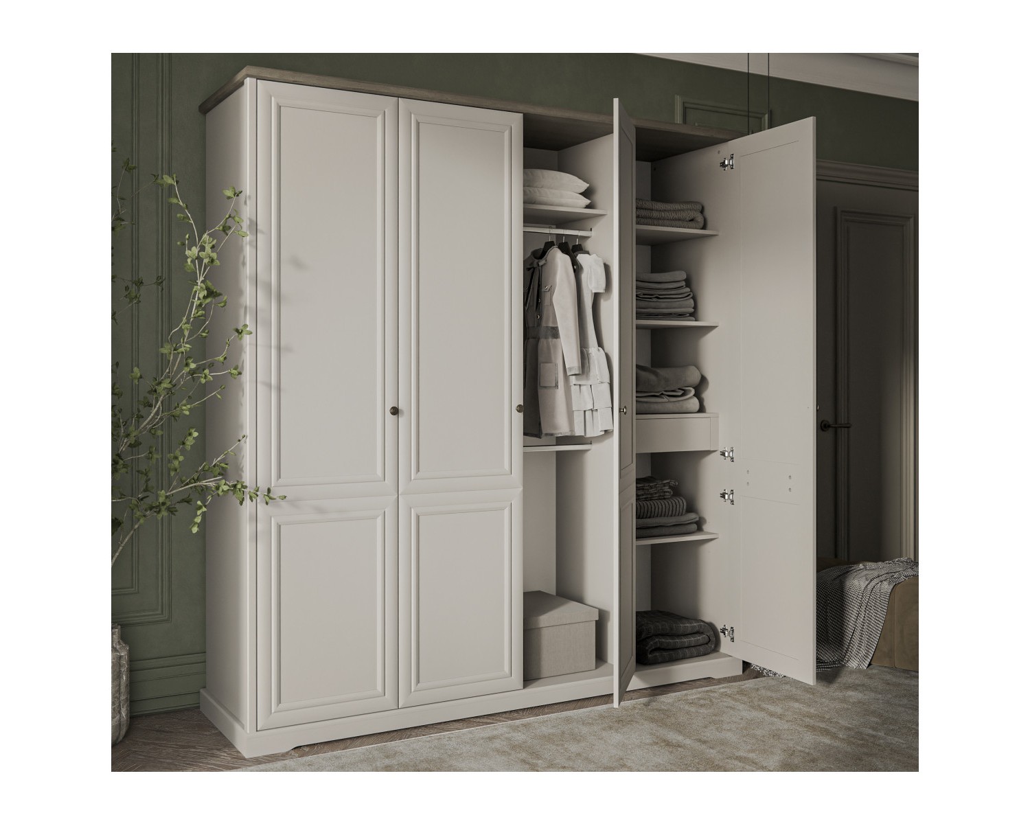 Шкаф 4DG TOSCANA NEW. Роскошный предмет мебели в классическом стиле, который украсит интерьер спальни. Конструкция шкафа 4DG прямая, представляет собой одно гардеробное отделение с полкой и двумя стационарными продольными штангами за двумя глухими дверями, два отделения с полками ЛДСП за двумя глухими дверями. Двери (4D) распашные, крепятся на петли к внутренним перегородкам и боковому корпусу изделия. Особенностью элемента является использование петель с доводчиками, высота – 2305 мм, возможность докупки ящика 46.