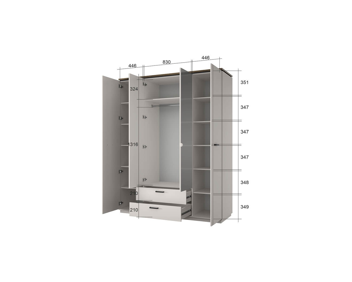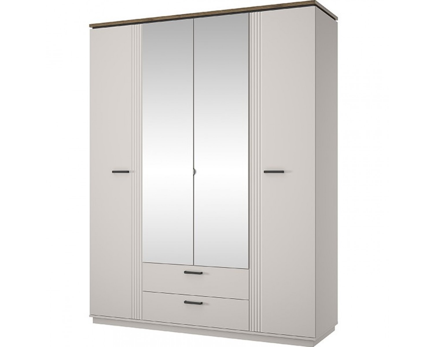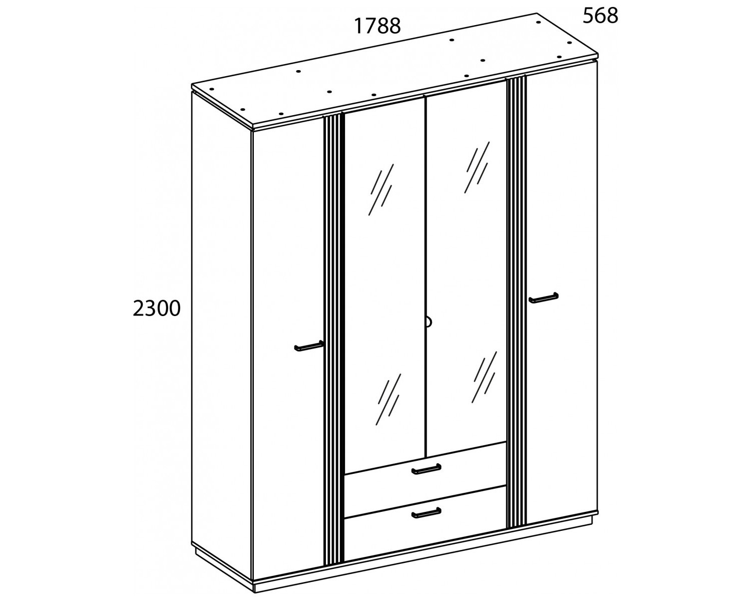 Шкаф 4DG2S Z коллекции VINATI – роскошный и функциональный организатор хранения в интерьере спальни. Модель выполнена в современном стиле и подойдёт для комнаты в классическом и современном стилях. Конструкция шкафа 4DG2S Z VINATI прямая, представляет собой два отделения с полками ЛДСП за глухими дверями, одно гардеробное отделение с нишей и стационарной штангой за двумя глухими дверями, два выдвижных ящика. Двери (4D) – распашные, крепятся к внутренним перегородкам и боковому корпусу изделия. Особенностью элемента является эстетический внешний вид, комплектация петлями с доводчиками, высота – 2300 мм. На средние двери снаружи крепятся зеркала.