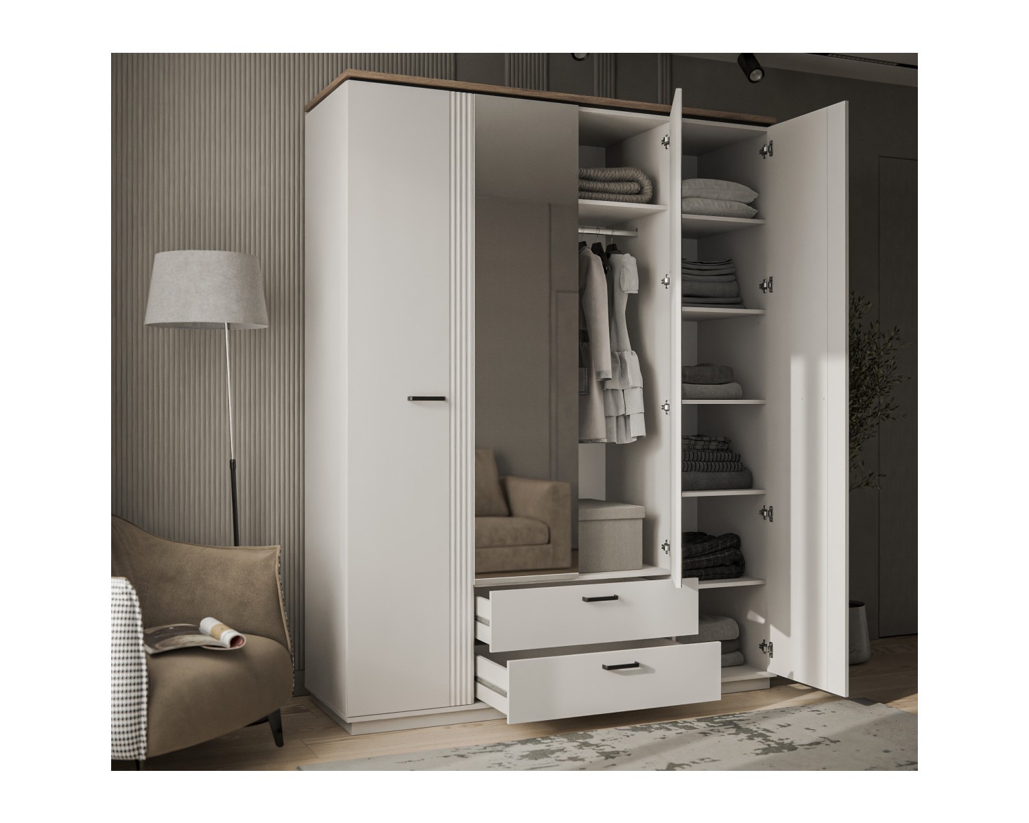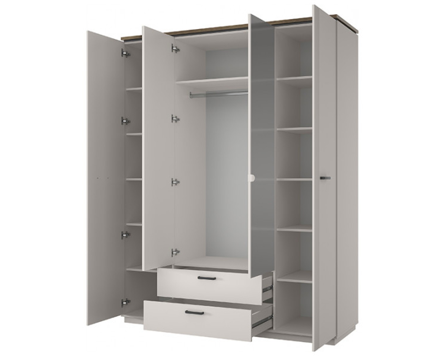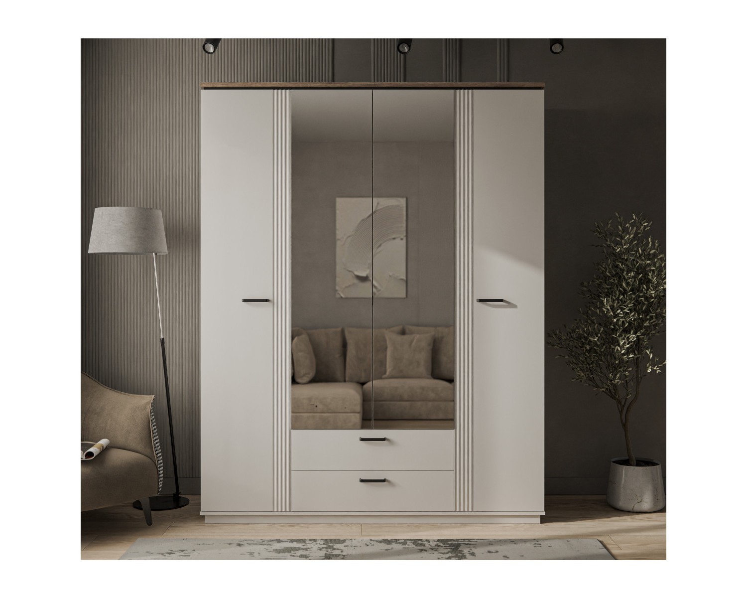 Шкаф 4DG2S Z коллекции VINATI – роскошный и функциональный организатор хранения в интерьере спальни. Модель выполнена в современном стиле и подойдёт для комнаты в классическом и современном стилях. Конструкция шкафа 4DG2S Z VINATI прямая, представляет собой два отделения с полками ЛДСП за глухими дверями, одно гардеробное отделение с нишей и стационарной штангой за двумя глухими дверями, два выдвижных ящика. Двери (4D) – распашные, крепятся к внутренним перегородкам и боковому корпусу изделия. Особенностью элемента является эстетический внешний вид, комплектация петлями с доводчиками, высота – 2300 мм. На средние двери снаружи крепятся зеркала.