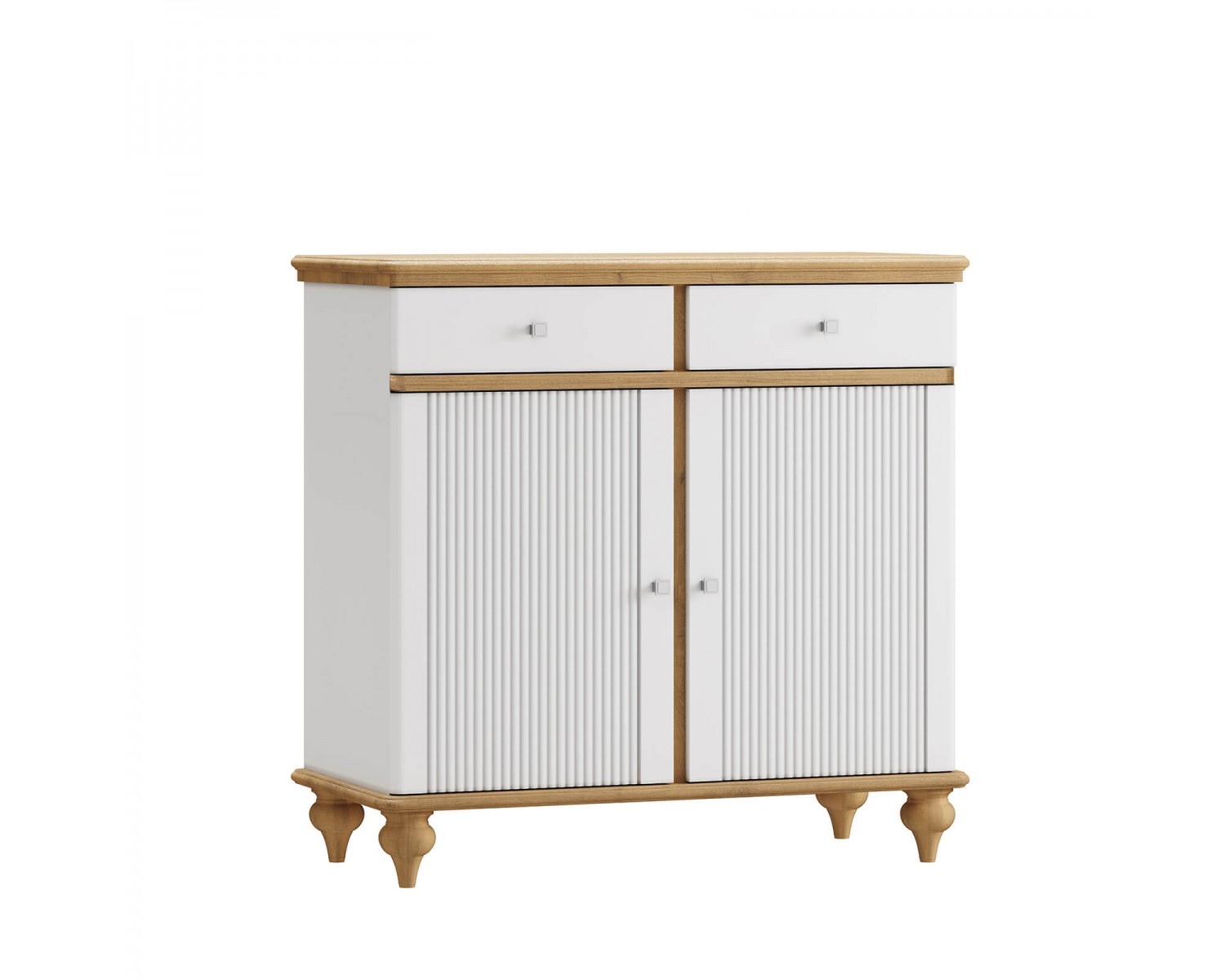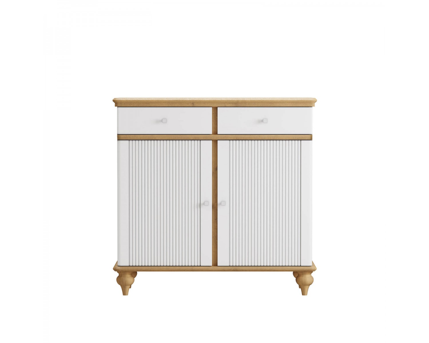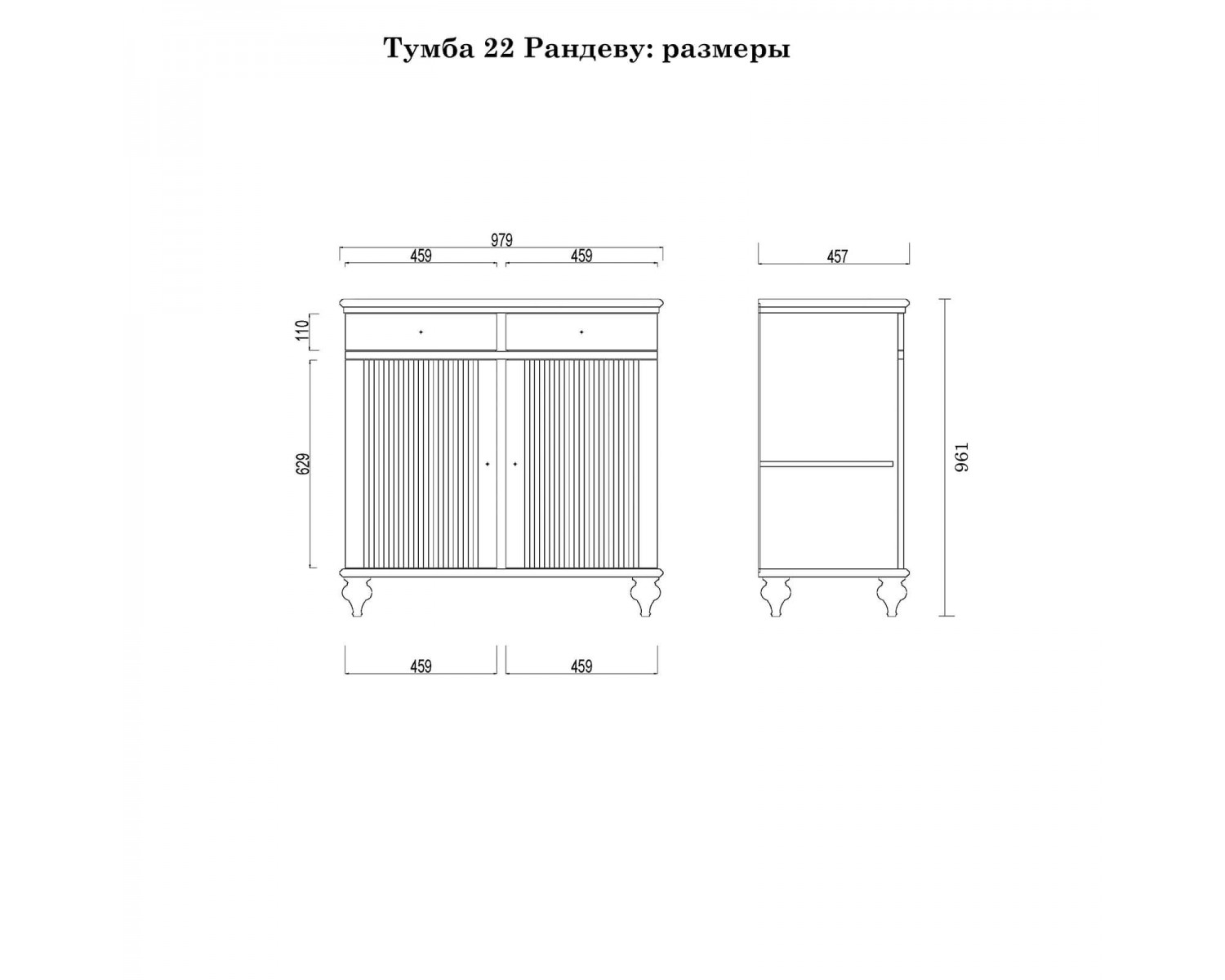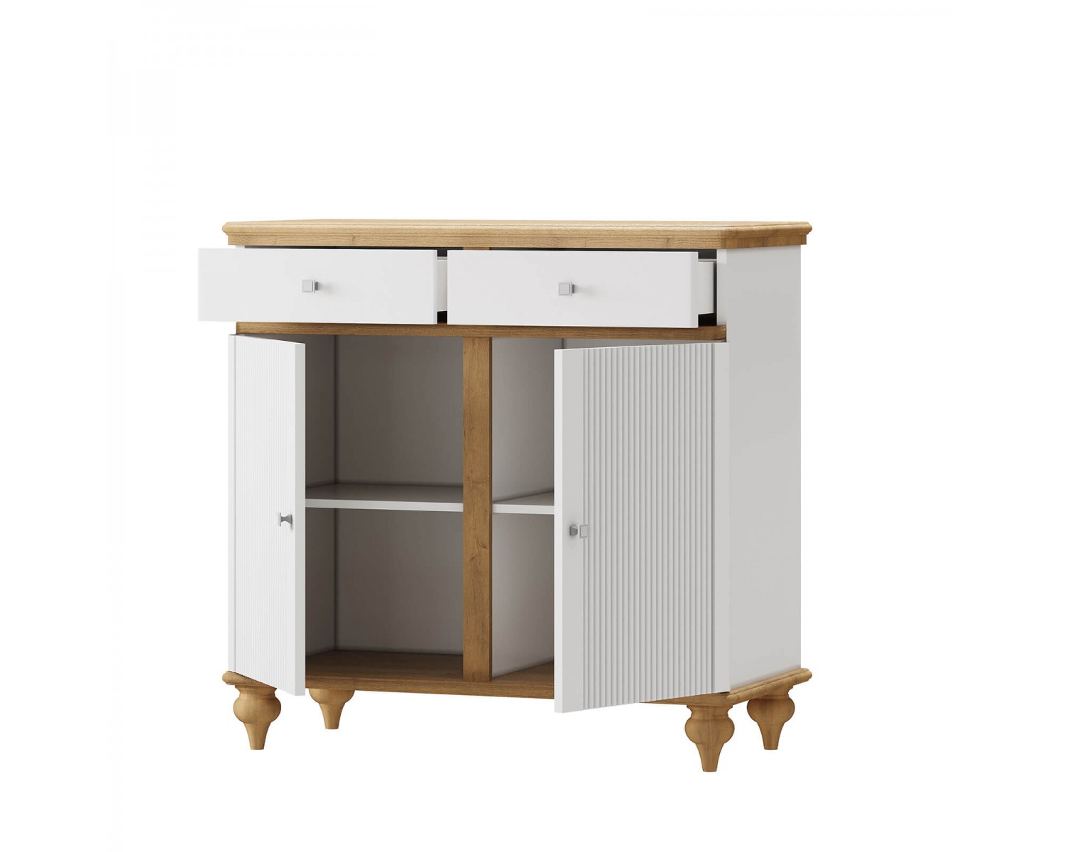 Комод разделен на два отсека в каждом из которого по одной полке за распашными дверями сверху два выдвижных ящика. Фурнитура на дверях и ящиках с доводчиками. Высокие ножки обеспечивают оптимальный доступ при уборке.