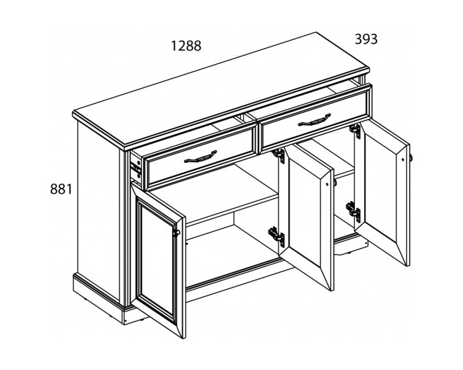 Тумба 3D2S TOSCANA NEW отличается от тумбы 3D2S-1 меньшей шириной (1288 мм) и более привычным расположением отделений. Разрешит многие вопросы по организации пространства из-за своей универсальности. Конструкция тумбы 3D2S прямая, представляет отделение с полкой ЛДСП за двумя глухими дверями, одно отделение с полкой ЛДСП за глухой дверью, два выдвижных ящика (2S). Двери (3D) распашные, крепятся на петли к внутренней перегородке и боковому корпусу изделия.