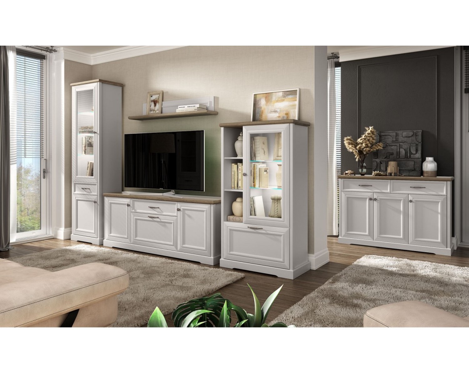 Гостиная TOSCANA Вариант 3 ПЕРСИДСКИЙ ЖЕМЧУГ/КАНЬОН - современная коллекция в классическом стиле для организации гостиной и спальной группы. Особенностью мебели является выбор контрастных текстур - дуб каньон и персидский жемчуг, декоративные планки на фасадах, утолщение верхних щитов, широкий выбор модулей для организации любой по площади комнаты, использование петель и шариковых направляющих с доводчиками.