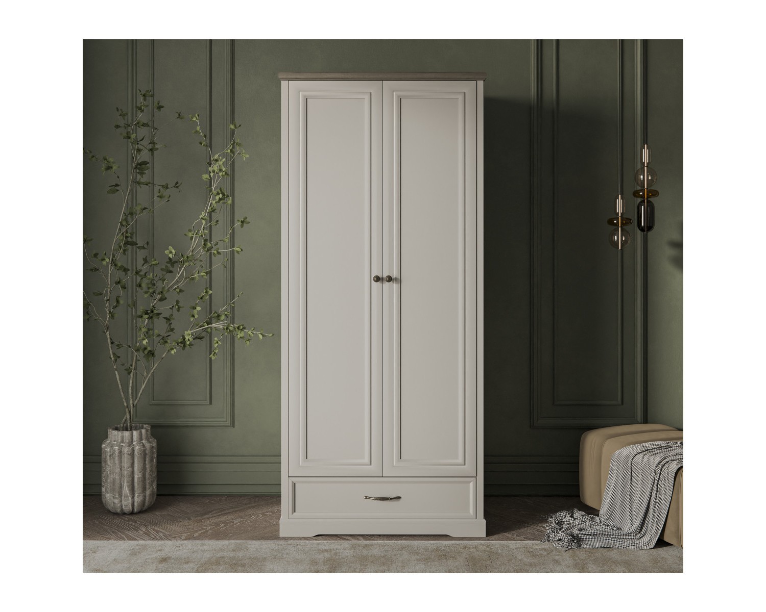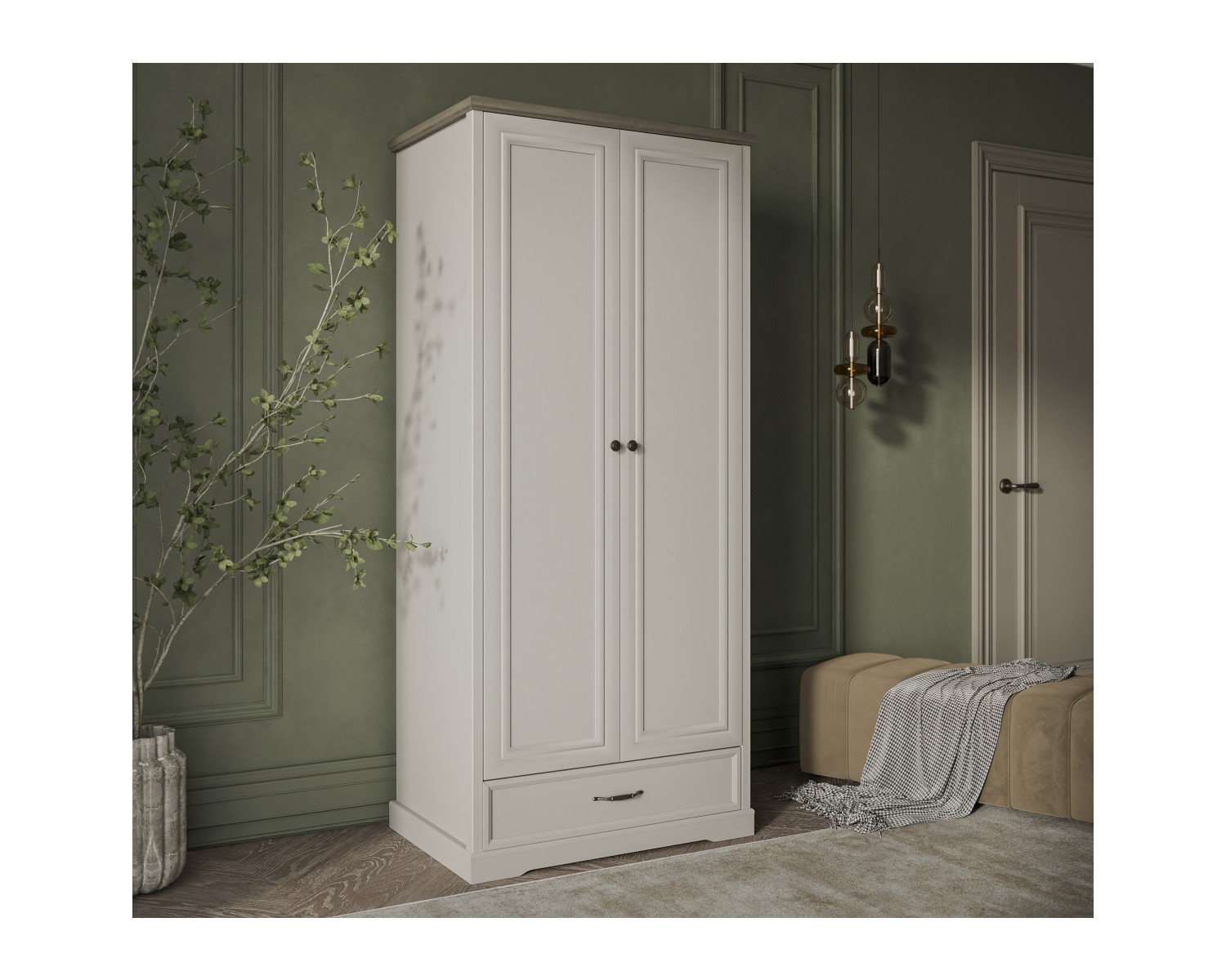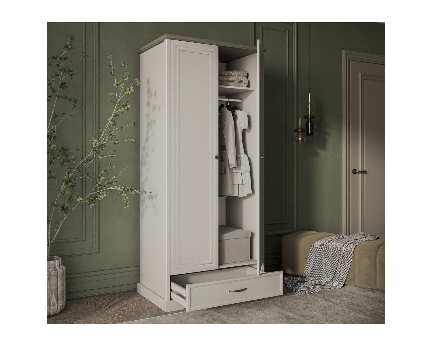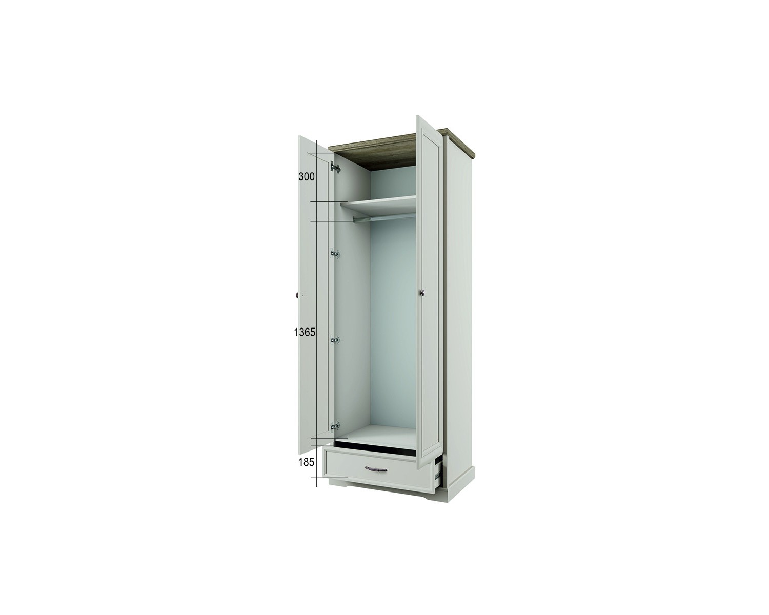 Шкаф 2DG1S TOSCANA NEW. Данная модель подойдёт для оформления и гостиной, и очень маленькой спальни при необходимости. Конструкция шкафа 2DG1S прямая, представляет собой одно гардеробное отделение с полкой ЛДСП и стационарной продольной штангой за двумя глухими дверями, один выдвижной ящик (1S). Двери (2D) распашные, крепятся на петли к боковому корпусу изделия.