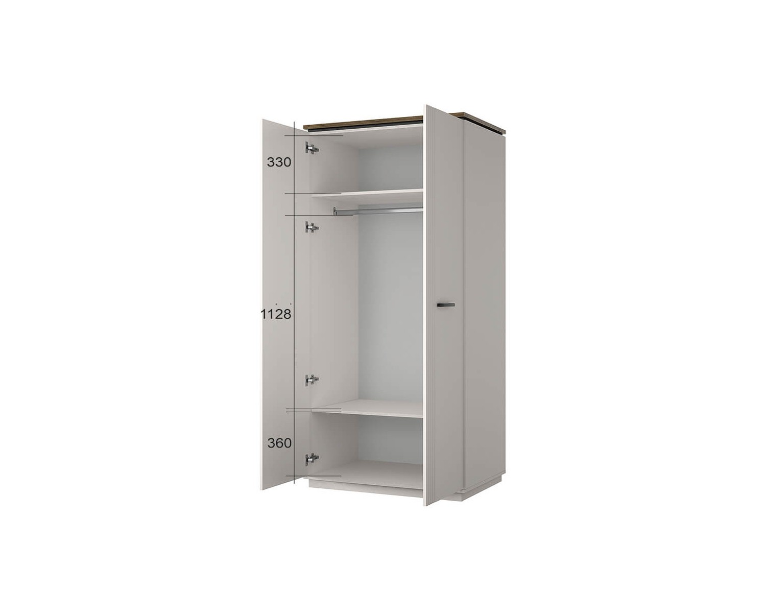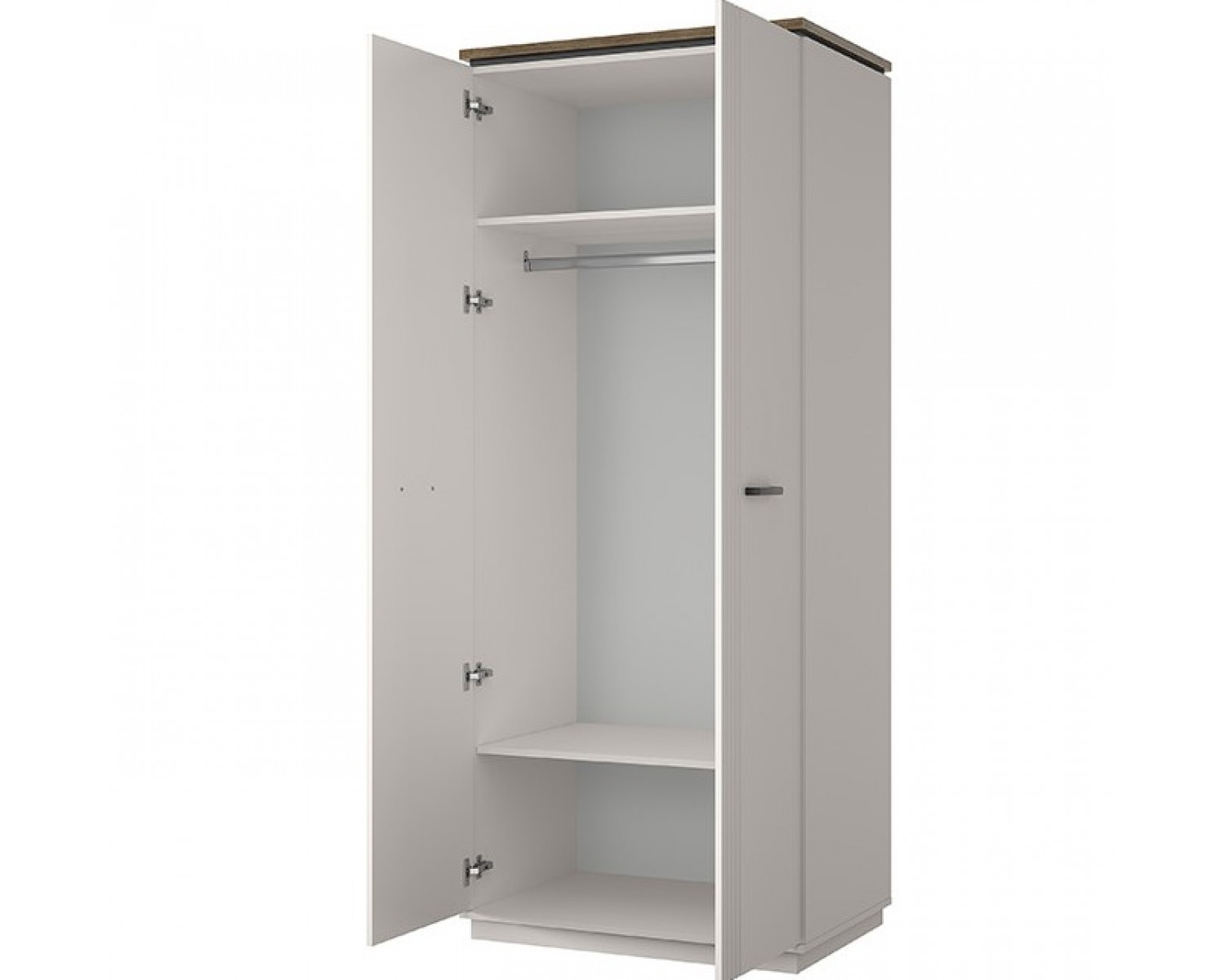 Шкаф 2DG VINATI – универсальный предмет мебели – может быть установлен в интерьере и спальни, и молодёжной/детской комнаты, и даже в гостиной. Конструкция шкафа 2DG VINATI прямая, представляет собой одно гардеробное отделение (G) с двумя нишами и одной стационарной штангой за двумя глухими дверями. Двери (2D) распашные, крепятся к боковому корпусу изделия. Особенностью элемента является эстетический внешний вид, комплектация петлями с доводчиками.