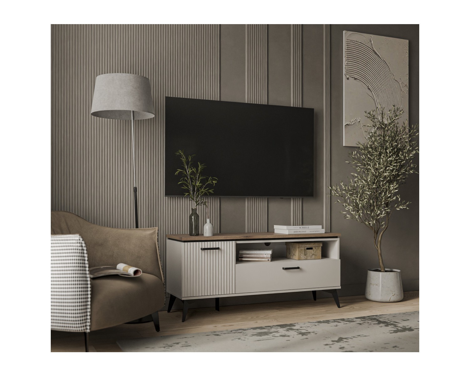 Тумба RTV 1D1SN VINATI. Если модель сравнивать с тумбой RTV 2D1SN VINATI, сокращена ширина – 1306 мм. Подойдёт для оформления гостиной с небольшой площадью. Может быть установлен как самостоятельный предмет мебели, так и в композиции с другими элементами коллекции VINATI. Конструкция тумбы RTV 1D1SN VINATI прямая, представляет собой одно отделение за глухой распашной дверью (1D), один выдвижной ящик (1S), одну открытую нишу (N). Дверь (1D) распашная, крепится на петли к боковому корпусу изделия.