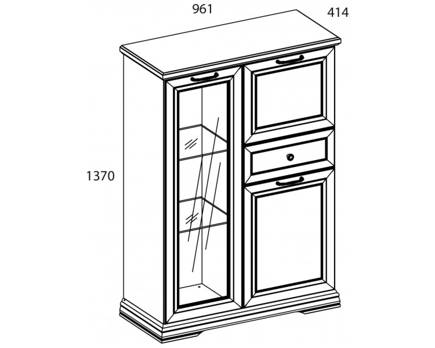 Шкаф с витриной 1V2D1S SEVILLA. Нестандартная высота элемента позволит разместить вещи не только внутри предмета мебели, но и на верхнем щите – декор, памятные вещи, награды и т.д. Наряду с другими позициями коллекции, такая модель оформит оригинальную и красивую композицию в интерьере, станет акцентом помещения. Шкаф может устанавливаться и как самостоятельный элемент. Конструкция шкафа с витриной 1V2D1S прямая, представляет собой одно отделение с полками из стекла за витриной (1V), два раздельных отделения за двумя глухими дверями (2D), один выдвижной ящик (1S). Витрины и глухая дверь внизу распашные, крепятся к боковому корпусу и внутренней перегородке; дверь, которая закрывает верхнее отделение, откидная и крепится посредством петель и газлифтов.