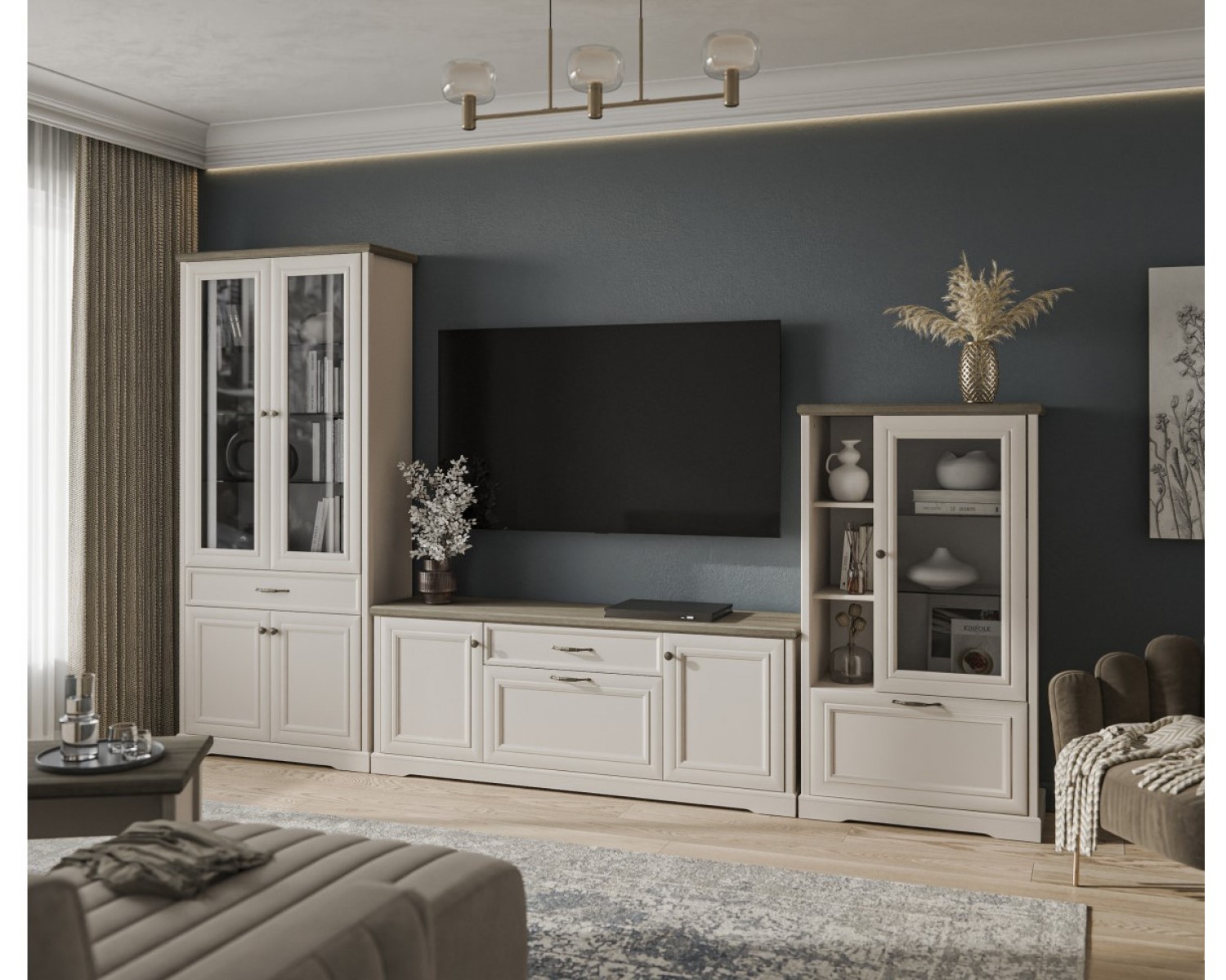 Материал: рамочно-филенчатая конструкция глухого фасада, рамка МДФ – 19 мм, филенка ЛДСП – 8 мм, цвет – персидский жемчуг 810 PO; витрина – закалённое стекло, 4 мм в рамке МДФ; фасады выдвижных ящиков – ЛДСП (16 мм - основа), МДФ (9 мм - планка), цвет – персидский жемчуг 810 PO.