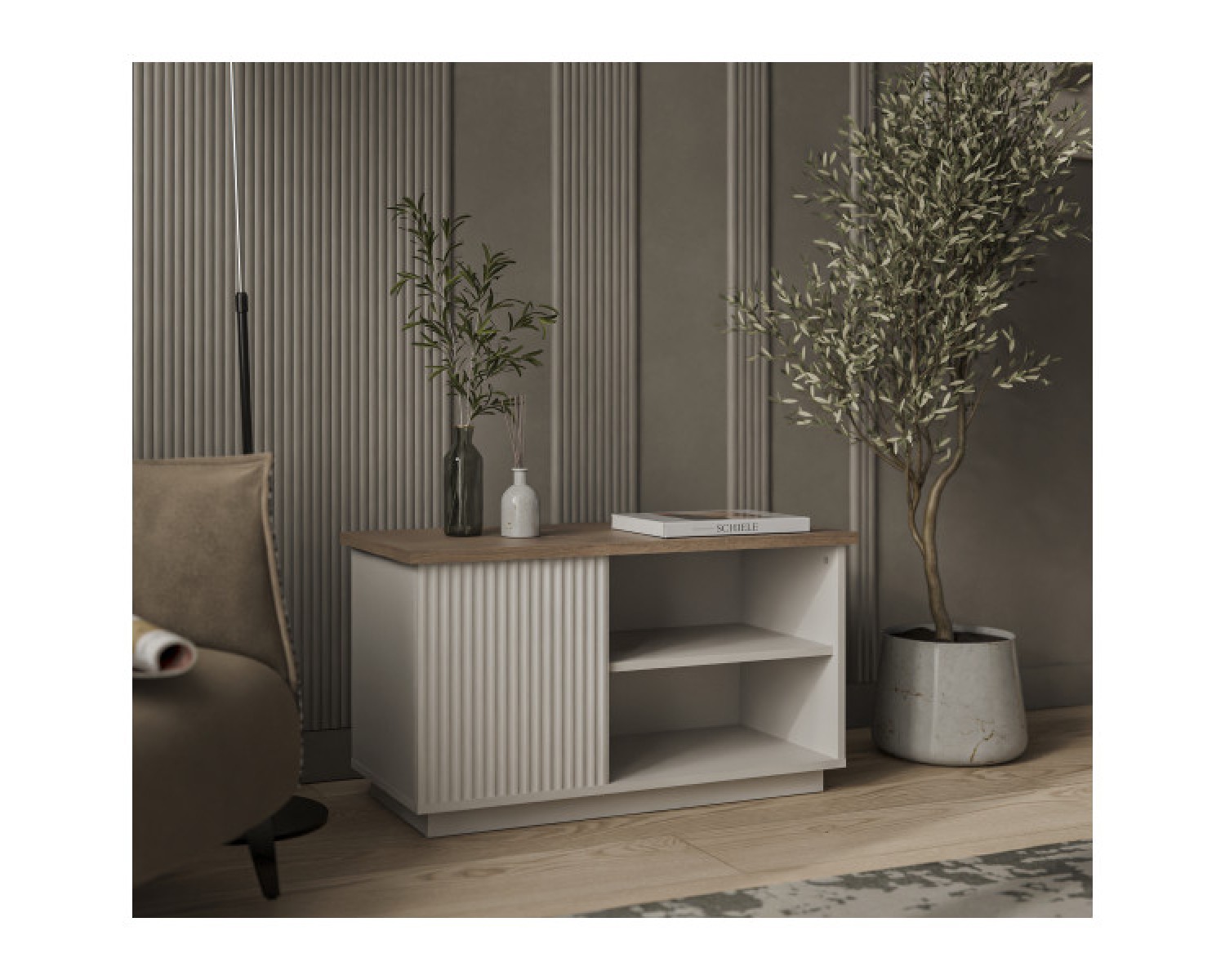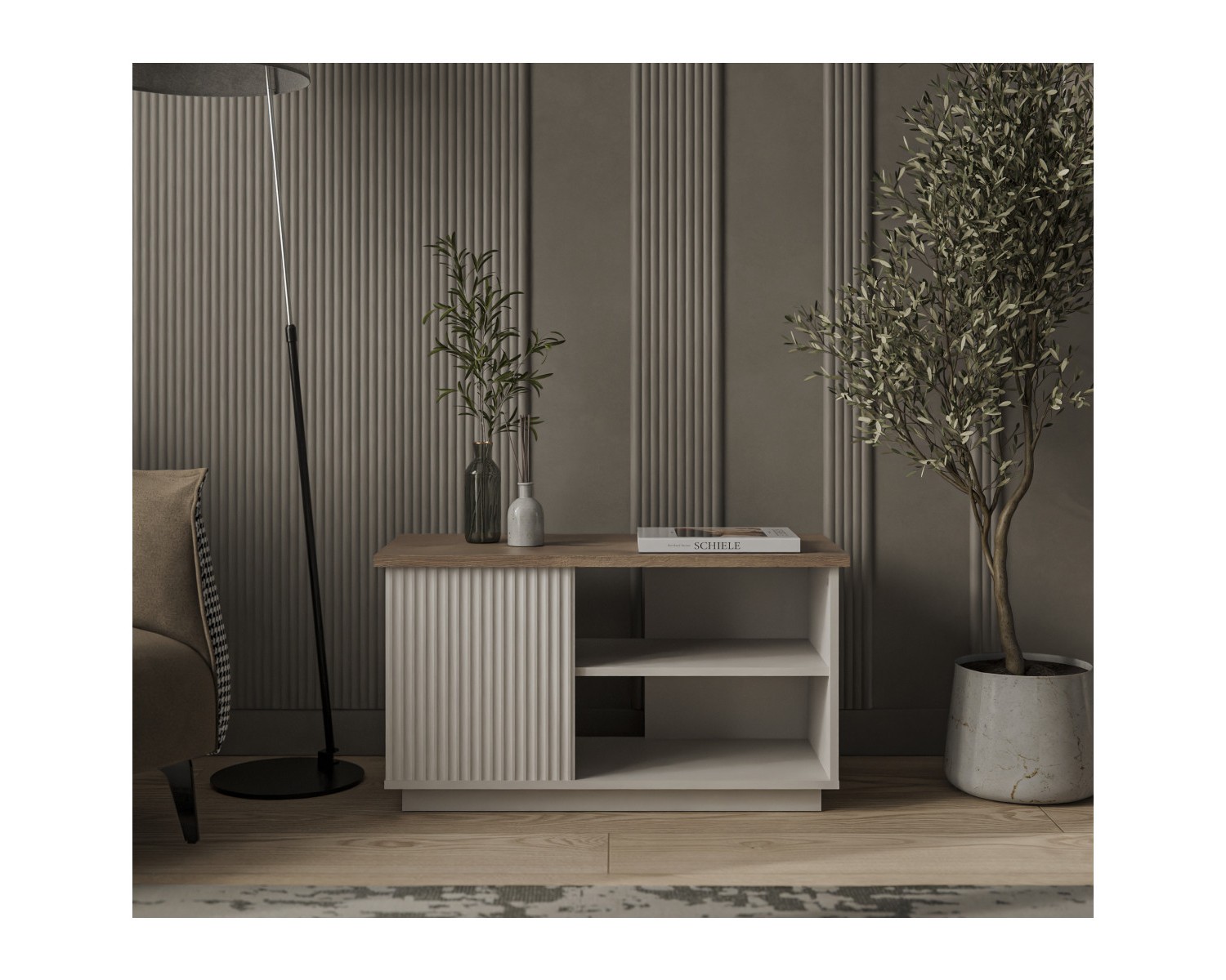 Стол журнальный VINATI – оригинальная конструкция элемента выделит индивидуальность интерьера гостиной. Стол журнальный имеет прямую конструкцию. Конструкция представляет собой столешницу прямоугольной формы в древесной текстуре, которая соединяется с нижним щитом посредством вертикальных панелей из ЛДСП и МДФ; предусмотрен цокольный пояс.