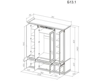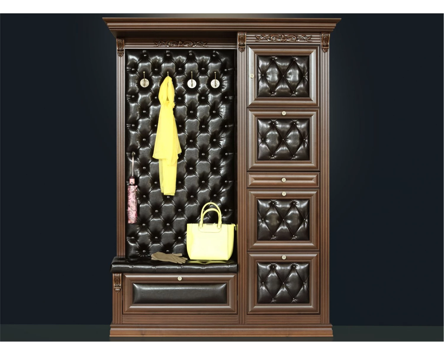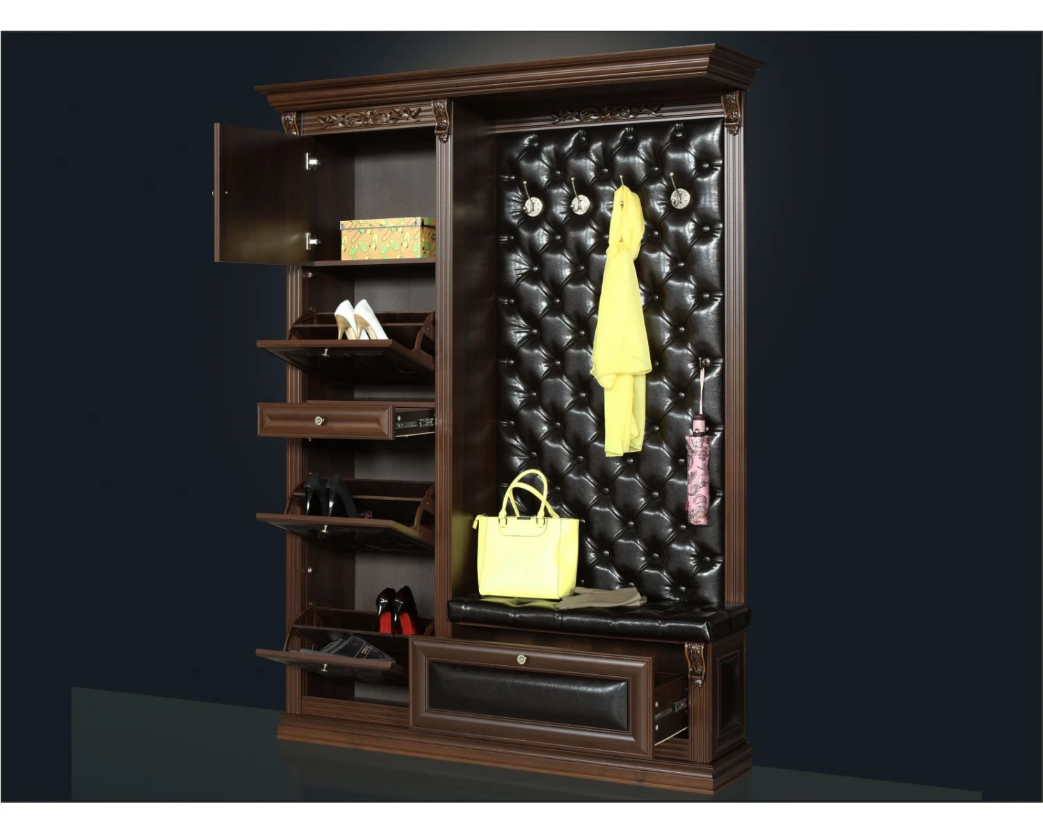 Вешалка с обувным шкафом Благо Б5.16-21. С правой стороны имеется обувной шкаф с откидными ящиками и ящиками для мелочей. В левой части находится открытая вешалка с большим ящиком для одежды. Сдержанный и нарядный декор и вставки из экокожи придают мебели особую элегантность. Оригинальная и очень удобная прихожая, прекрасно подойдет для классического интерьера.