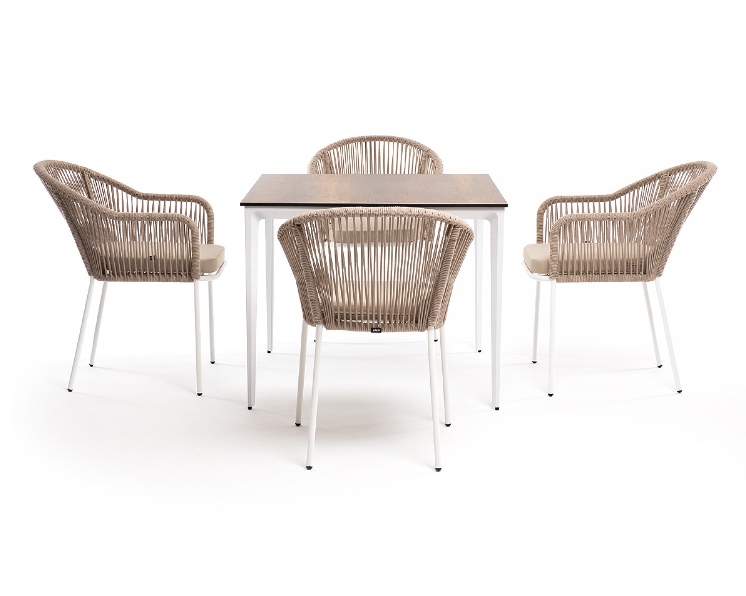 Обеденная группа «Малага» рассчитана на 4 персоны. В состав комплекта входит: - Стол «Малага» со столешницей из HPL-пластика, размер столешницы - 900×900 мм, цвет - «дуб». Высота стола - 750 мм. - 4 плетеных стула «Лион» из роупа, размером - 570×620×820 мм, цвет роупа - бежевый, каркас - белый.